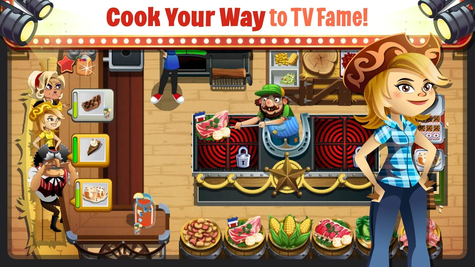 Sharpen your skill as you prepare, cook, assemble and serve delicious menu items in each exotic restaurant in front of a live studio audience! Hear them gasp and cheer as you try to earn profits in each exciting episode! Quirky customers, superstar VIPs, and fast-paced kitchen action and TV fame await!